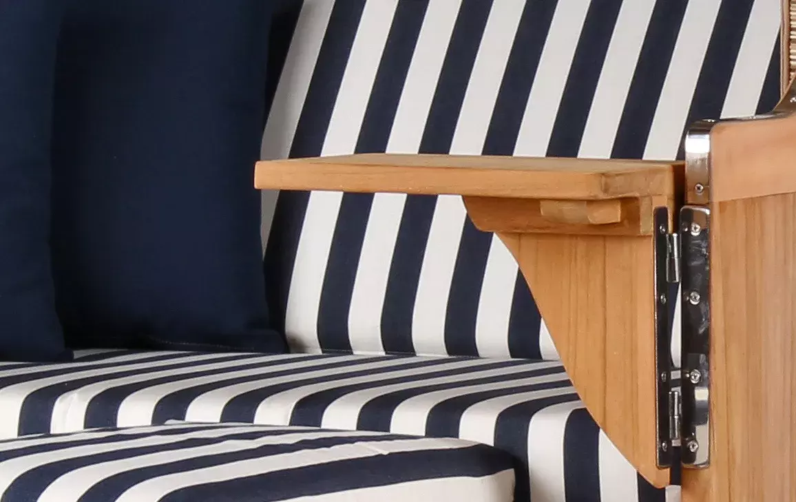 Neben dem massiven Teakholz und beständigen PE-Geflecht verwenden wir für unseren Strandkorb Rantum ausschließlich hochwertige Edelstahlbeschläge aus V2A-Edelstahl. Diese Beschläge kommen bei der Befestigung der Bistrotische, der Verstärkung der unteren Ecken und beim Feststellmechanismus der Verstellgriffe zum Einsatz. Komplettiert wird der Strandkorb Rantum durch eine Vielzahl durchdachter Extras. So verfügt der Strandkorb Rantum nicht nur über eine extra-dicke Polsterung, sondern auch über farblich passende Wurfkissen und verstellbare Nackenkissen. Zeitungstaschen, integrierte Armlehnen, zwei große, schwenkbare und zudem abnehmbare Bistrotische und ein praktisches Staufach unterhalb der Sitzfläche lassen keine Wünsche offen und machen den Strandkorb Rantum bald auch zu Ihrem Lieblingsplatz im Garten oder auf der Terrasse.