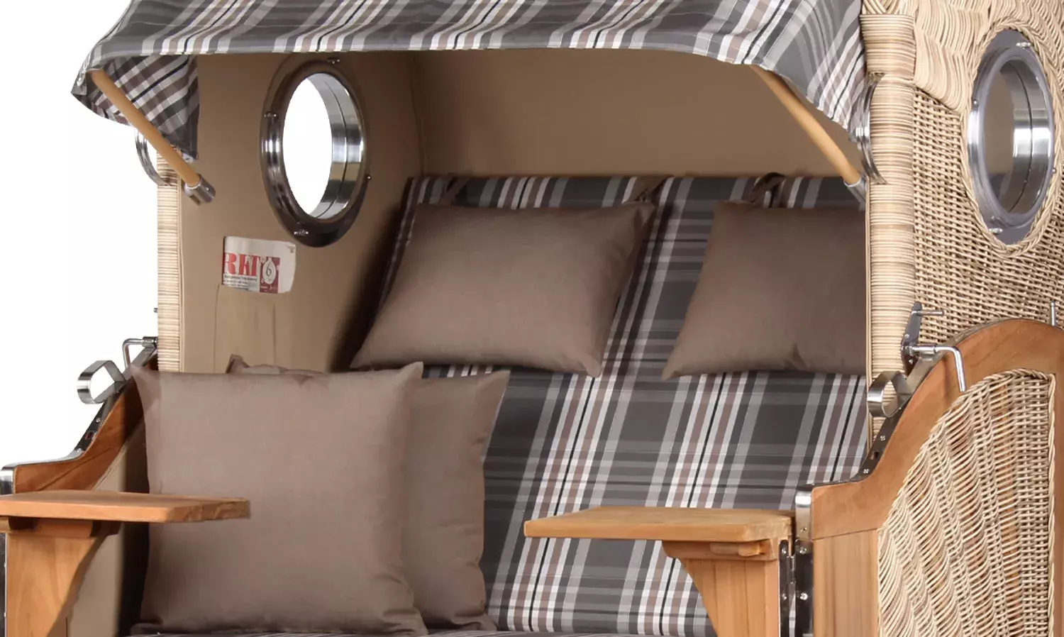 Die aufwendig gestaltete Flechtung des Strandkorbes wird in liebevoller Handarbeit für jeden Strandkorb einzeln erstellt. Die interessante Sonnenflechtung des Seitenteils und die formschöne Einbindung des Bullauges zeugen von hohem handwerklichem Geschick und verleihen dem Strandkorb Rantum ein außergewöhnliches und einzigartiges Design. Das verwendete PE (Polyethylen)-Geflecht ist ideal für den Einsatz im Freien, denn es ist robust und temperaturbeständig, besonders auch bei hohen Temperaturschwankungen. Zudem ist die glatte Oberfläche des Geflechtes schmutz- und witterungsabweisend. Weitere Vorteile wie UV-Beständigkeit und Farbechtheit machen Ihren Strandkorb Rantum zu einem langjährigen Begleiter, an dem Sie lange Ihre Freude haben werden!