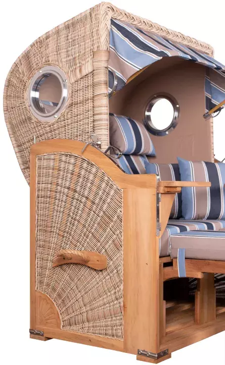 Die aufwendig gestaltete Flechtung des Strandkorbes wird in liebevoller Handarbeit für jeden Strandkorb einzeln erstellt. Die interessante Sonnenflechtung des Seitenteils und die formschöne Einbindung des Bullauges zeugen von hohem handwerklichem Geschick und verleihen dem Strandkorb Rantum ein außergewöhnliches und einzigartiges Design. Das verwendete PE (Polyethylen)-Geflecht ist ideal für den Einsatz im Freien, denn es ist robust und temperaturbeständig, besonders auch bei hohen Temperaturschwankungen. Zudem ist die glatte Oberfläche des Geflechtes schmutz- und witterungsabweisend. Weitere Vorteile wie UV-Beständigkeit und Farbechtheit machen Ihren Strandkorb Rantum zu einem langjährigen Begleiter, an dem Sie lange Ihre Freude haben werden!