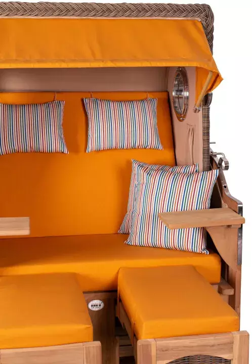 Die aufwendig gestaltete Flechtung des Strandkorbes wird in liebevoller Handarbeit für jeden Strandkorb einzeln erstellt. Die interessante Sonnenflechtung des Seitenteils und die formschöne Einbindung des Bullauges zeugen von hohem handwerklichem Geschick und verleihen dem Strandkorb Rantum ein außergewöhnliches und einzigartiges Design. Das verwendete PE (Polyethylen)-Geflecht ist ideal für den Einsatz im Freien, denn es ist robust und temperaturbeständig, besonders auch bei hohen Temperaturschwankungen. Zudem ist die glatte Oberfläche des Geflechtes schmutz- und witterungsabweisend. Weitere Vorteile wie UV-Beständigkeit und Farbechtheit machen Ihren Strandkorb Rantum zu einem langjährigen Begleiter, an dem Sie lange Ihre Freude haben werden!