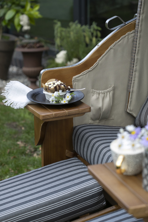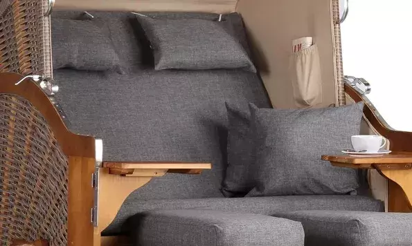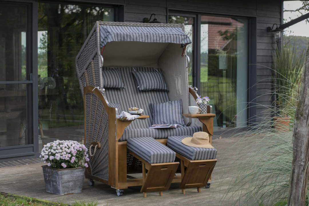 Entspannung in Perfektion im Strandkorb Schleswig Pinie in Mokka Braun mit Dessin 560