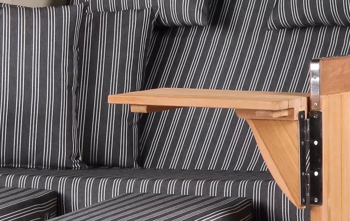 Neben dem massiven Teakholz und beständigen PE-Geflecht verwenden wir für unseren Strandkorb Westerland ausschließlich hochwertige Edelstahlbeschläge aus V2A-Edelstahl. Diese Beschläge kommen bei der Befestigung der Bistrotische, der Verstärkung der unteren Ecken und beim Feststellmechanismus der Verstellgriffe zum Einsatz. Komplettiert wird der Strandkorb Westerland durch eine Vielzahl durchdachter Extras. So verfügt der Strandkorb Westerland nicht nur über eine extra-dicke Polsterung, sondern auch über farblich passende Wurfkissen und verstellbare Nackenkissen. Zeitungstaschen, integrierte Armlehnen, zwei große, schwenkbare und zudem abnehmbare Bistrotische und ein praktisches Staufach unterhalb der Sitzfläche lassen keine Wünsche offen und machen den Strandkorb Westerland bald auch zu Ihrem Lieblingsplatz im Garten oder auf der Terrasse.