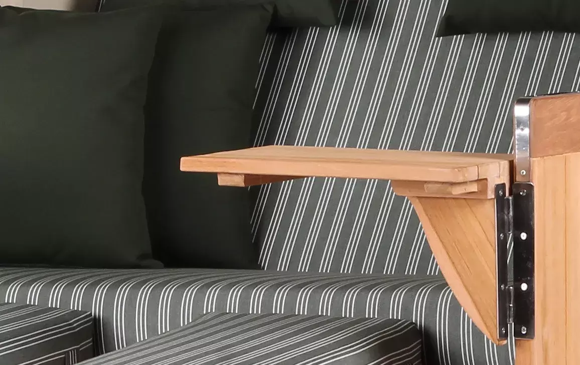 Neben dem massiven Teakholz und beständigen PE-Geflecht verwenden wir für unseren Strandkorb Westerland ausschließlich hochwertige Edelstahlbeschläge aus V2A-Edelstahl. Diese Beschläge kommen bei der Befestigung der Bistrotische, der Verstärkung der unteren Ecken und beim Feststellmechanismus der Verstellgriffe zum Einsatz. Komplettiert wird der Strandkorb Westerland durch eine Vielzahl durchdachter Extras. So verfügt der Strandkorb Westerland nicht nur über eine extra-dicke Polsterung, sondern auch über farblich passende Wurfkissen und verstellbare Nackenkissen. Zeitungstaschen, integrierte Armlehnen, zwei große, schwenkbare und zudem abnehmbare Bistrotische und ein praktisches Staufach unterhalb der Sitzfläche lassen keine Wünsche offen und machen den Strandkorb Westerland bald auch zu Ihrem Lieblingsplatz im Garten oder auf der Terrasse.
