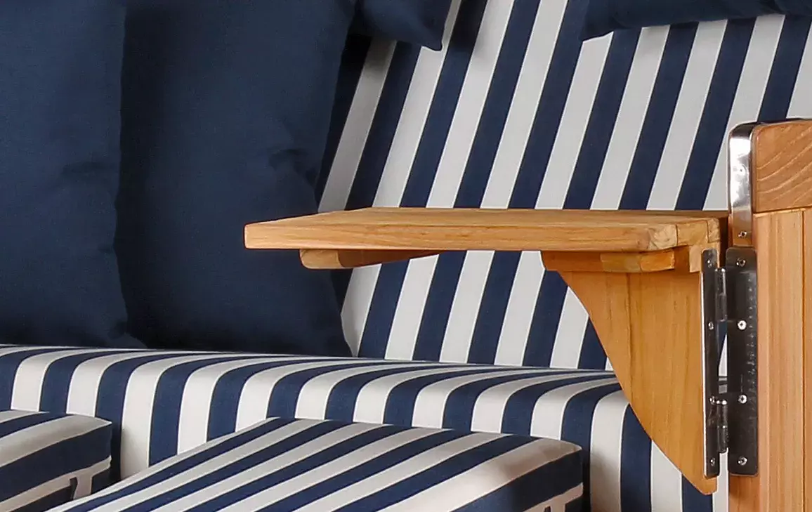 Neben dem massiven Teakholz und beständigen PE-Geflecht verwenden wir für unseren Strandkorb Westerland ausschließlich hochwertige Edelstahlbeschläge aus V2A-Edelstahl. Diese Beschläge kommen bei der Befestigung der Bistrotische, der Verstärkung der unteren Ecken und beim Feststellmechanismus der Verstellgriffe zum Einsatz. Komplettiert wird der Strandkorb Westerland durch eine Vielzahl durchdachter Extras. So verfügt der Strandkorb Westerland nicht nur über eine extra-dicke Polsterung, sondern auch über farblich passende Wurfkissen und verstellbare Nackenkissen. Zeitungstaschen, integrierte Armlehnen, zwei große, schwenkbare und zudem abnehmbare Bistrotische und ein praktisches Staufach unterhalb der Sitzfläche lassen keine Wünsche offen und machen den Strandkorb Westerland bald auch zu Ihrem Lieblingsplatz im Garten oder auf der Terrasse.