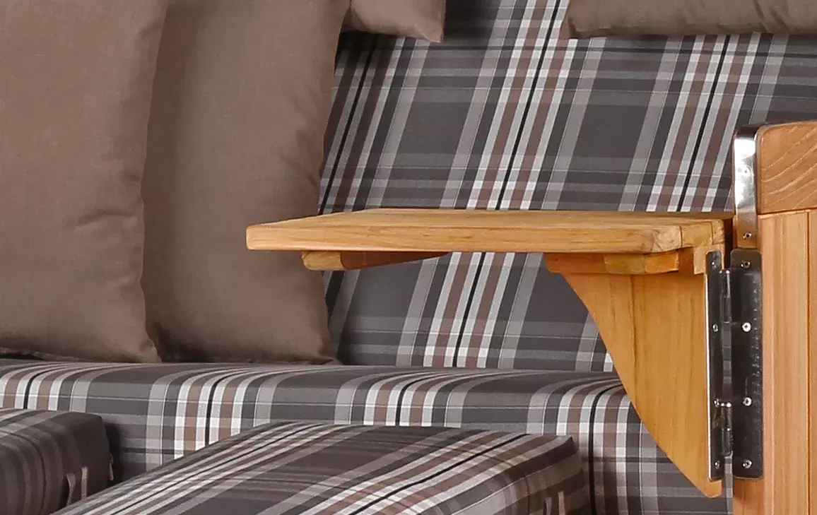 Neben dem massiven Teakholz und beständigen PE-Geflecht verwenden wir für unseren Strandkorb Westerland ausschließlich hochwertige Edelstahlbeschläge aus V2A-Edelstahl. Diese Beschläge kommen bei der Befestigung der Bistrotische, der Verstärkung der unteren Ecken und beim Feststellmechanismus der Verstellgriffe zum Einsatz. Komplettiert wird der Strandkorb Westerland durch eine Vielzahl durchdachter Extras. So verfügt der Strandkorb Westerland nicht nur über eine extra-dicke Polsterung, sondern auch über farblich passende Wurfkissen und verstellbare Nackenkissen. Zeitungstaschen, integrierte Armlehnen, zwei große, schwenkbare und zudem abnehmbare Bistrotische und ein praktisches Staufach unterhalb der Sitzfläche lassen keine Wünsche offen und machen den Strandkorb Westerland bald auch zu Ihrem Lieblingsplatz im Garten oder auf der Terrasse.