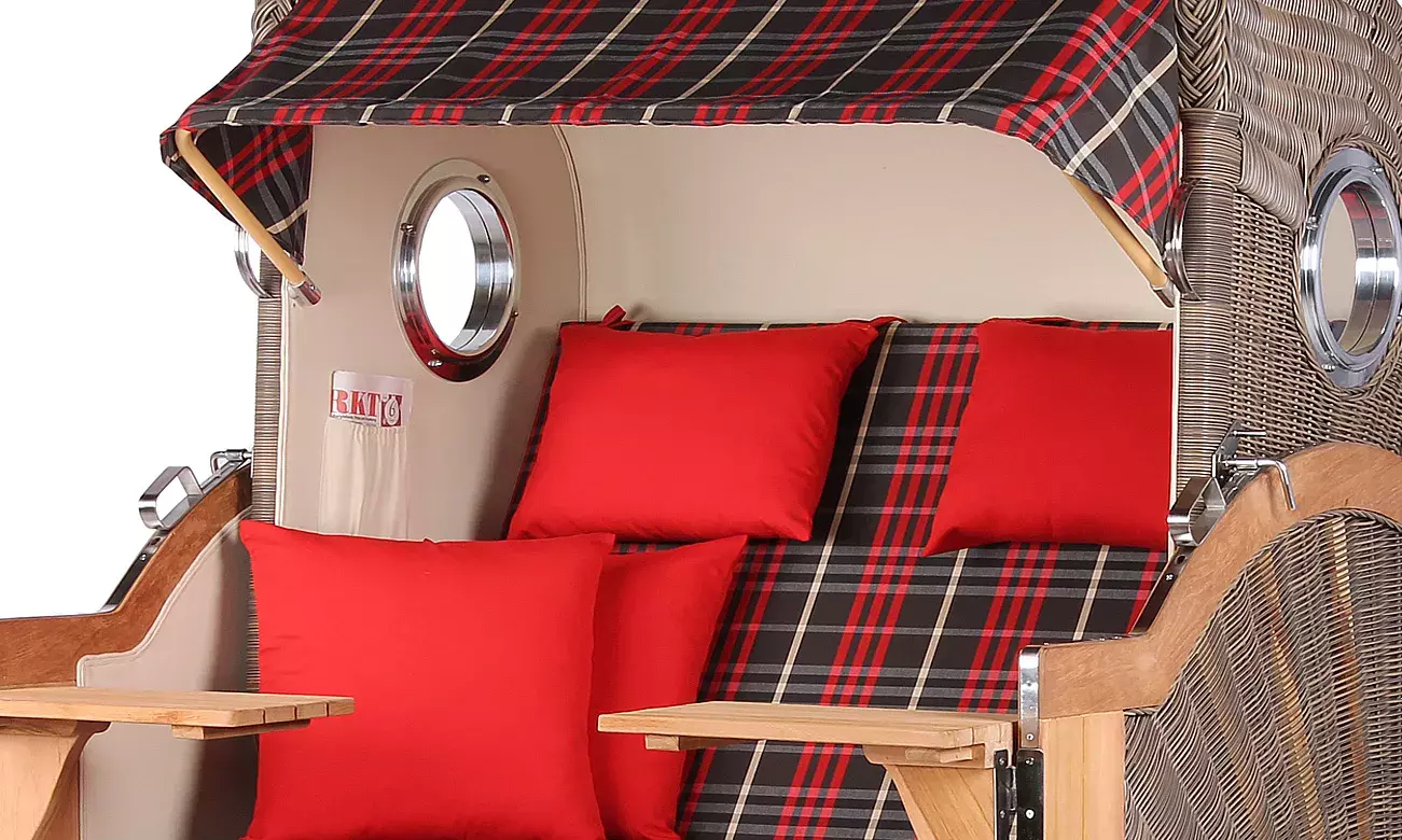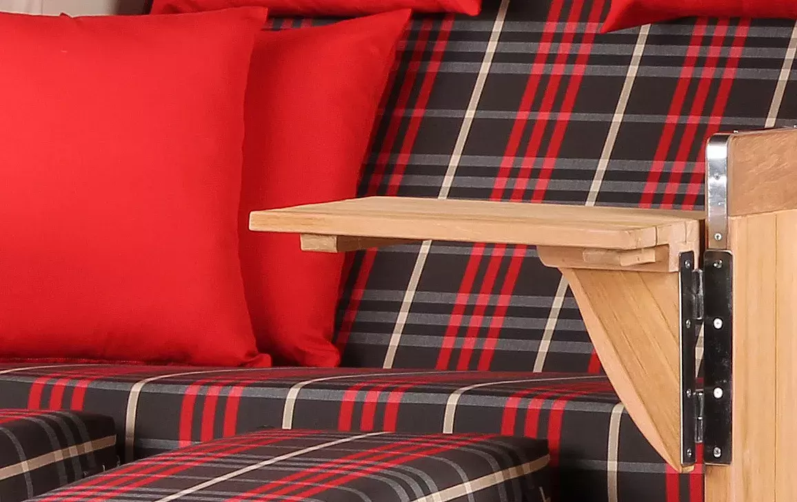 Neben dem massiven Teakholz und beständigen PE-Geflecht verwenden wir für unseren Strandkorb Westerland ausschließlich hochwertige Edelstahlbeschläge aus V2A-Edelstahl. Diese Beschläge kommen bei der Befestigung der Bistrotische, der Verstärkung der unteren Ecken und beim Feststellmechanismus der Verstellgriffe zum Einsatz. Komplettiert wird der Strandkorb Westerland durch eine Vielzahl durchdachter Extras. So verfügt der Strandkorb Westerland nicht nur über eine extra-dicke Polsterung, sondern auch über farblich passende Wurfkissen und verstellbare Nackenkissen. Zeitungstaschen, integrierte Armlehnen, zwei große, schwenkbare und zudem abnehmbare Bistrotische und ein praktisches Staufach unterhalb der Sitzfläche lassen keine Wünsche offen und machen den Strandkorb Westerland bald auch zu Ihrem Lieblingsplatz im Garten oder auf der Terrasse.