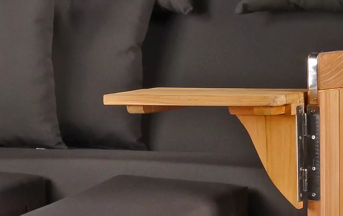 Neben dem massiven Teakholz und beständigen PE-Geflecht verwenden wir für unseren Strandkorb Westerland ausschließlich hochwertige Edelstahlbeschläge aus V2A-Edelstahl. Diese Beschläge kommen bei der Befestigung der Bistrotische, der Verstärkung der unteren Ecken und beim Feststellmechanismus der Verstellgriffe zum Einsatz. Komplettiert wird der Strandkorb Westerland durch eine Vielzahl durchdachter Extras. So verfügt der Strandkorb Westerland nicht nur über eine extra-dicke Polsterung, sondern auch über farblich passende Wurfkissen und verstellbare Nackenkissen. Zeitungstaschen, integrierte Armlehnen, zwei große, schwenkbare und zudem abnehmbare Bistrotische und ein praktisches Staufach unterhalb der Sitzfläche lassen keine Wünsche offen und machen den Strandkorb Westerland bald auch zu Ihrem Lieblingsplatz im Garten oder auf der Terrasse.