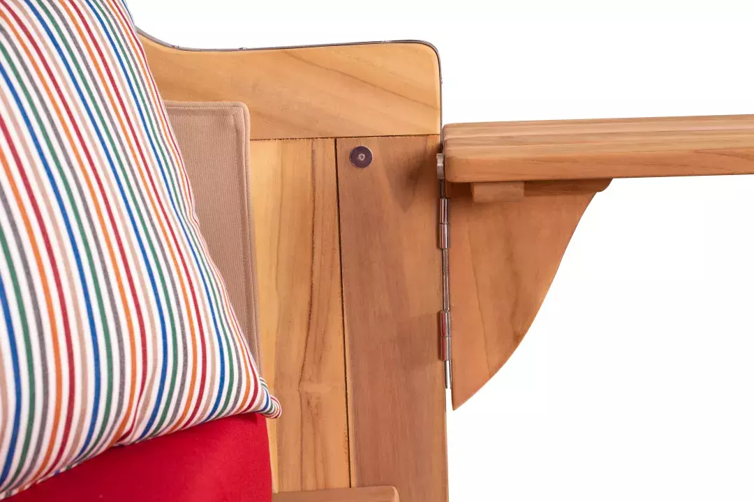 Neben dem massiven Teakholz und beständigen PE-Geflecht verwenden wir für unseren Strandkorb Westerland ausschließlich hochwertige Edelstahlbeschläge aus V2A-Edelstahl. Diese Beschläge kommen bei der Befestigung der Bistrotische, der Verstärkung der unteren Ecken und beim Feststellmechanismus der Verstellgriffe zum Einsatz. Komplettiert wird der Strandkorb Westerland durch eine Vielzahl durchdachter Extras. So verfügt der Strandkorb Westerland nicht nur über eine extra-dicke Polsterung, sondern auch über farblich passende Wurfkissen und verstellbare Nackenkissen. Zeitungstaschen, integrierte Armlehnen, zwei große, schwenkbare und zudem abnehmbare Bistrotische und ein praktisches Staufach unterhalb der Sitzfläche lassen keine Wünsche offen und machen den Strandkorb Westerland bald auch zu Ihrem Lieblingsplatz im Garten oder auf der Terrasse.