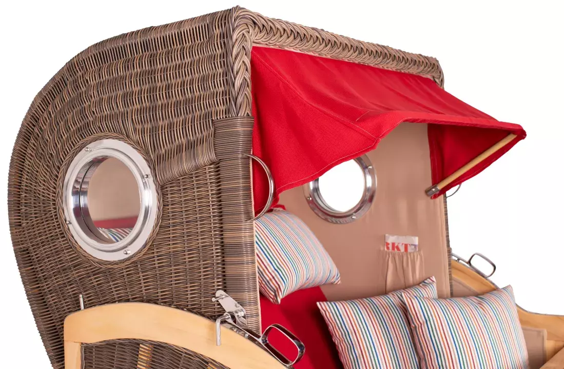 Die aufwendig gestaltete Flechtung des Strandkorbes wird in liebevoller Handarbeit für jeden Strandkorb einzeln erstellt. Die interessante Sonnenflechtung des Seitenteils und die formschöne Einbindung des Bullauges zeugen von hohem handwerklichem Geschick und verleihen dem Strandkorb Westerland ein außergewöhnliches und einzigartiges Design. Das verwendete PE (Polyethylen)-Geflecht ist ideal für den Einsatz im Freien, denn es ist robust und temperaturbeständig, besonders auch bei hohen Temperaturschwankungen. Zudem ist die glatte Oberfläche des Geflechtes schmutz- und witterungsabweisend. Weitere Vorteile wie UV-Beständigkeit und Farbechtheit machen Ihren Strandkorb Westerland zu einem langjährigen Begleiter, an dem Sie lange Ihre Freude haben werden!