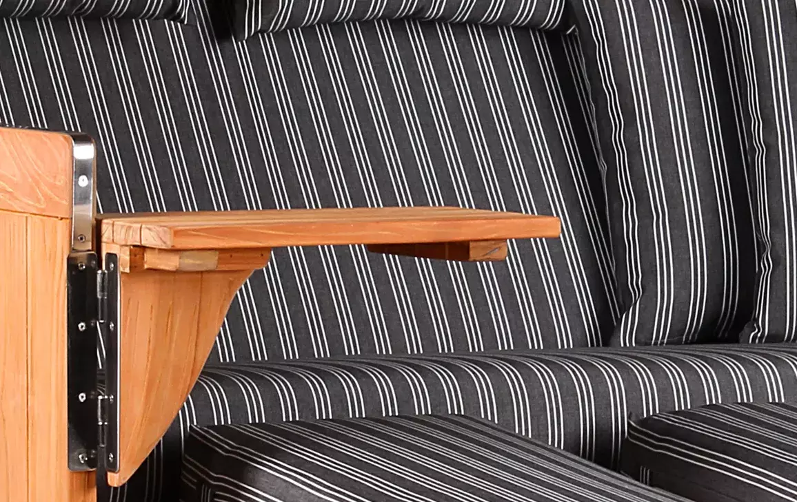Neben dem massiven Teakholz und beständigen PE-Geflecht verwenden wir für unseren Strandkorb Westerland XXL ausschließlich hochwertige Edelstahlbeschläge aus V2A-Edelstahl. Diese Beschläge kommen bei der Befestigung der Bistrotische, der Verstärkung der unteren Ecken und beim Feststellmechanismus der Verstellgriffe zum Einsatz. Komplettiert wird der Strandkorb Westerland XXL durch eine Vielzahl durchdachter Extras. So verfügt der Strandkorb Westerland nicht nur über eine extra-dicke Polsterung, sondern auch über farblich passende Wurfkissen und verstellbare Nackenkissen. Zeitungstaschen, integrierte Armlehnen, zwei große, schwenkbare und zudem abnehmbare Bistrotische und ein praktisches Staufach unterhalb der Sitzfläche lassen keine Wünsche offen und machen den Strandkorb Westerland XXL bald auch zu Ihrem Lieblingsplatz im Garten oder auf der Terrasse.