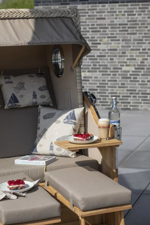 Neben dem massiven Teakholz und beständigen PE-Geflecht verwenden wir für unseren Strandkorb Westerland XXL ausschließlich hochwertige Edelstahlbeschläge aus V2A-Edelstahl. Diese Beschläge kommen bei der Befestigung der Bistrotische, der Verstärkung der unteren Ecken und beim Feststellmechanismus der Verstellgriffe zum Einsatz. Komplettiert wird der Strandkorb Westerland XXL durch eine Vielzahl durchdachter Extras. So verfügt der Strandkorb Westerland nicht nur über eine extra-dicke Polsterung, sondern auch über farblich passende Wurfkissen und verstellbare Nackenkissen. Zeitungstaschen, integrierte Armlehnen, zwei große, schwenkbare und zudem abnehmbare Bistrotische und ein praktisches Staufach unterhalb der Sitzfläche lassen keine Wünsche offen und machen den Strandkorb Westerland XXL bald auch zu Ihrem Lieblingsplatz im Garten oder auf der Terrasse.