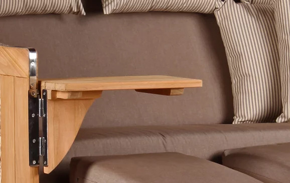 Neben dem massiven Teakholz und beständigen PE-Geflecht verwenden wir für unseren Strandkorb Westerland XXL ausschließlich hochwertige Edelstahlbeschläge aus V2A-Edelstahl. Diese Beschläge kommen bei der Befestigung der Bistrotische, der Verstärkung der unteren Ecken und beim Feststellmechanismus der Verstellgriffe zum Einsatz. Komplettiert wird der Strandkorb Westerland XXL durch eine Vielzahl durchdachter Extras. So verfügt der Strandkorb Westerland nicht nur über eine extra-dicke Polsterung, sondern auch über farblich passende Wurfkissen und verstellbare Nackenkissen. Zeitungstaschen, integrierte Armlehnen, zwei große, schwenkbare und zudem abnehmbare Bistrotische und ein praktisches Staufach unterhalb der Sitzfläche lassen keine Wünsche offen und machen den Strandkorb Westerland XXL bald auch zu Ihrem Lieblingsplatz im Garten oder auf der Terrasse.