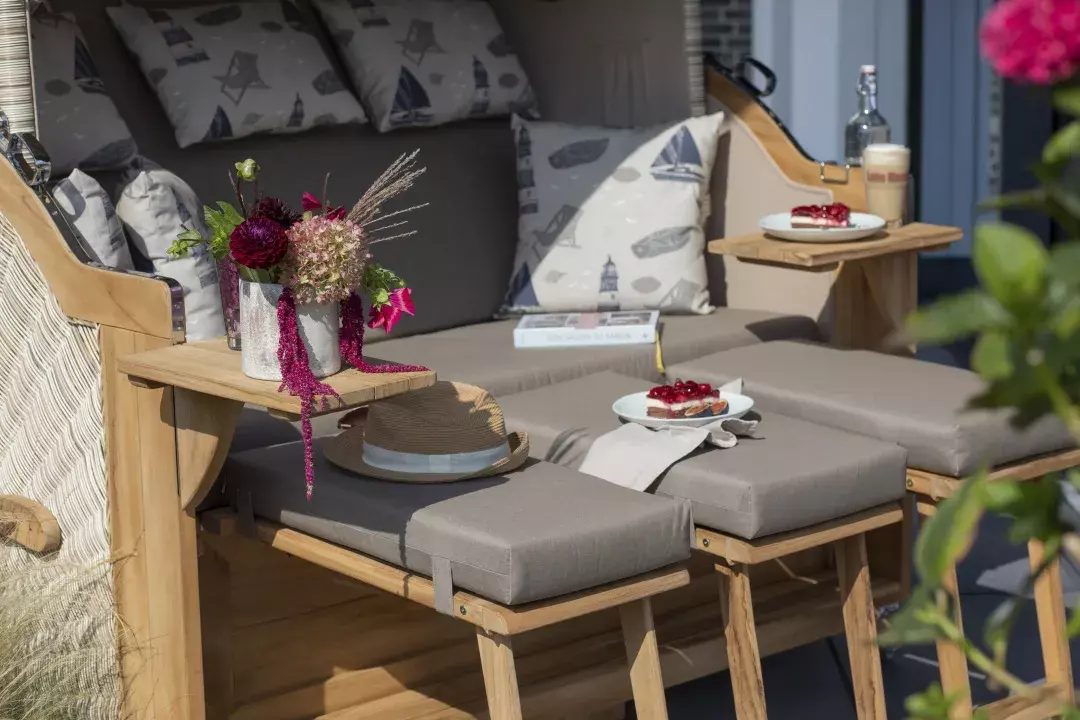 Neben dem massiven Teakholz und beständigen PE-Geflecht verwenden wir für unseren Strandkorb Westerland XXL ausschließlich hochwertige Edelstahlbeschläge aus V2A-Edelstahl. Diese Beschläge kommen bei der Befestigung der Bistrotische, der Verstärkung der unteren Ecken und beim Feststellmechanismus der Verstellgriffe zum Einsatz. Komplettiert wird der Strandkorb Westerland XXL durch eine Vielzahl durchdachter Extras. So verfügt der Strandkorb Westerland nicht nur über eine extra-dicke Polsterung, sondern auch über farblich passende Wurfkissen und verstellbare Nackenkissen. Zeitungstaschen, integrierte Armlehnen, zwei große, schwenkbare und zudem abnehmbare Bistrotische und ein praktisches Staufach unterhalb der Sitzfläche lassen keine Wünsche offen und machen den Strandkorb Westerland XXL bald auch zu Ihrem Lieblingsplatz im Garten oder auf der Terrasse.
