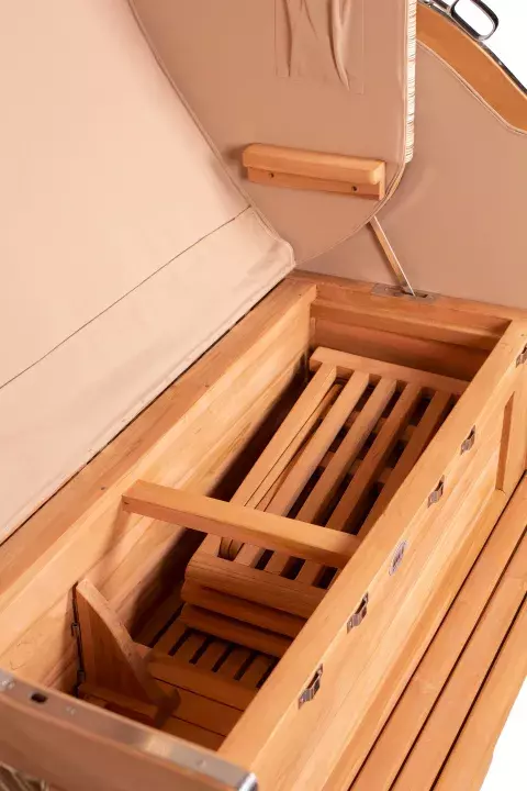 Optional erhalten Sie zum Strandkorb Westerland XXL ein Lifter-System, dass das Verstellen des Oberkorbs jetzt noch leichter macht. So lässt sich der aus Massivholz gefertigte Strandkorb Westerland XXL auch durch eine Person kinderleicht verstellen. Sprechen Sie uns an - wir beraten Sie gerne!